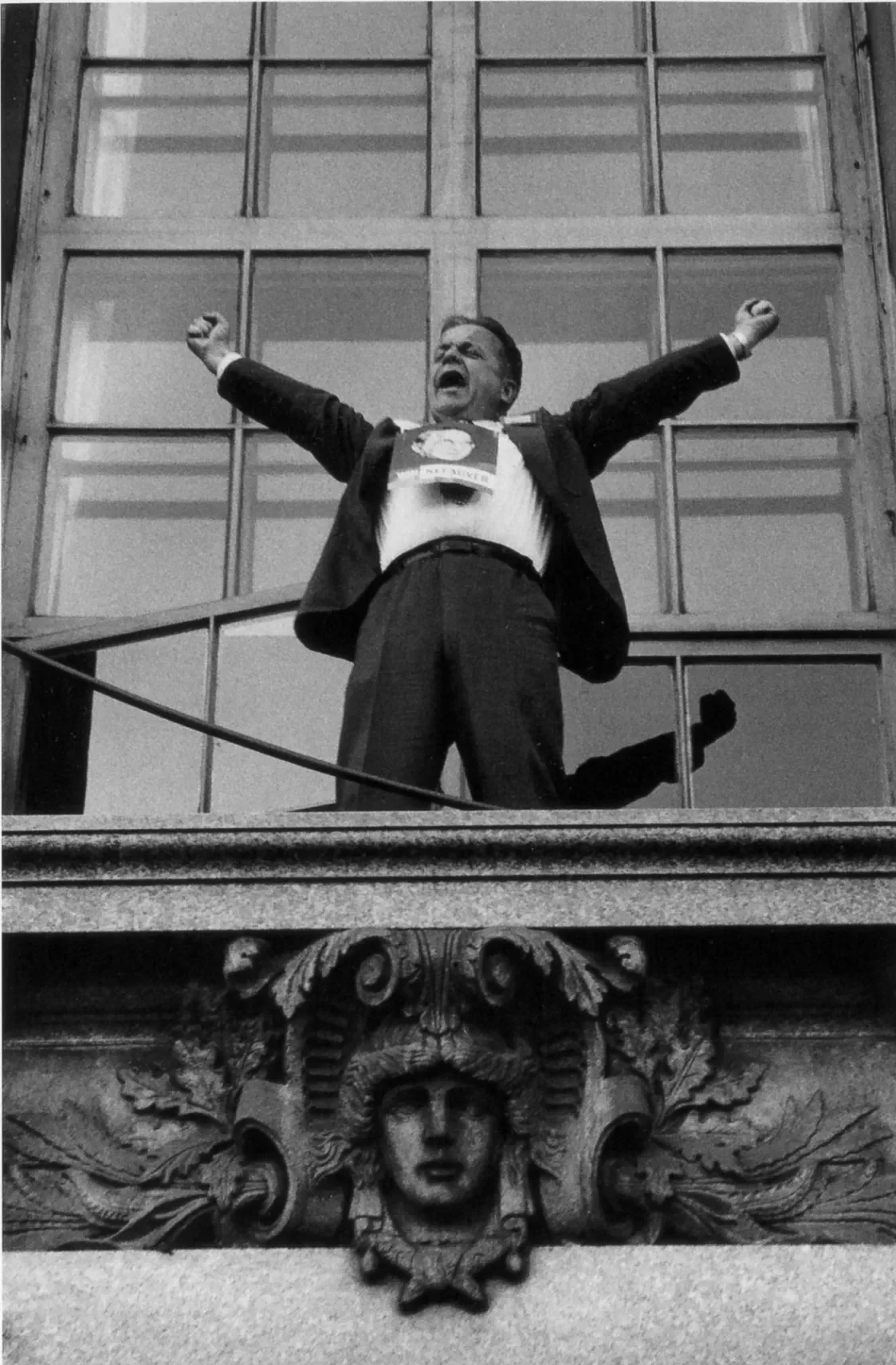 Signos: la bandera funciona como símbolo de patriotismo que contrasta con la realidad social; la multitud es índice de conformismo.