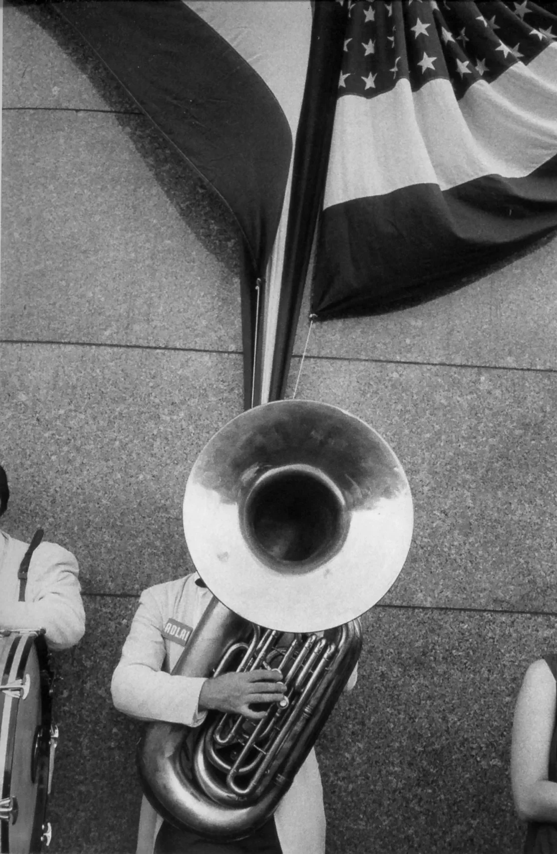 Repetición de elementos: banderas, coches y multitudes funcionan como símbolos de la sociedad estadounidense y sus contradicciones.